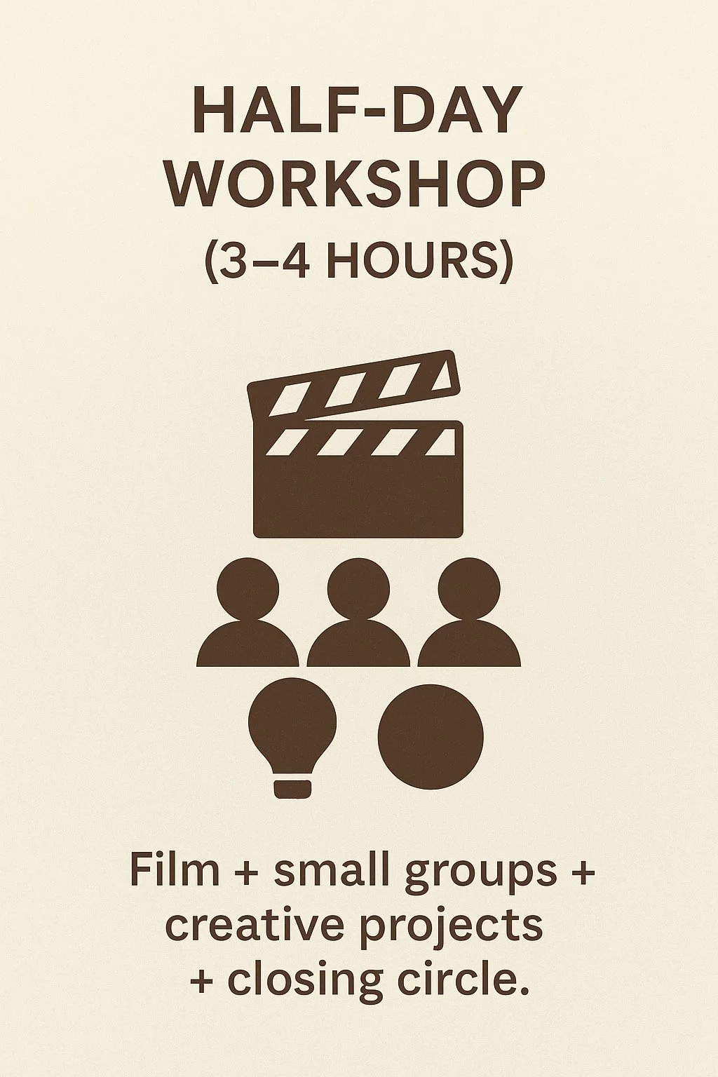 A creative and collaborative session combining film viewing, small group discussions, and hands-on projects. Participants explore self-expression and community storytelling, ending with a closing circle to share insights and connections.